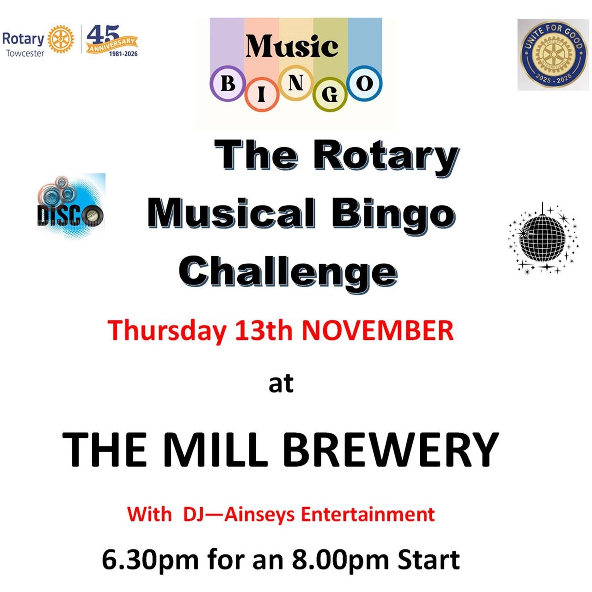 Help raise funds for the Rotary Club of Towcester with their very own Musical Bingo Challenge, here at the Mill!  All you have to do is reserve your spaces here...